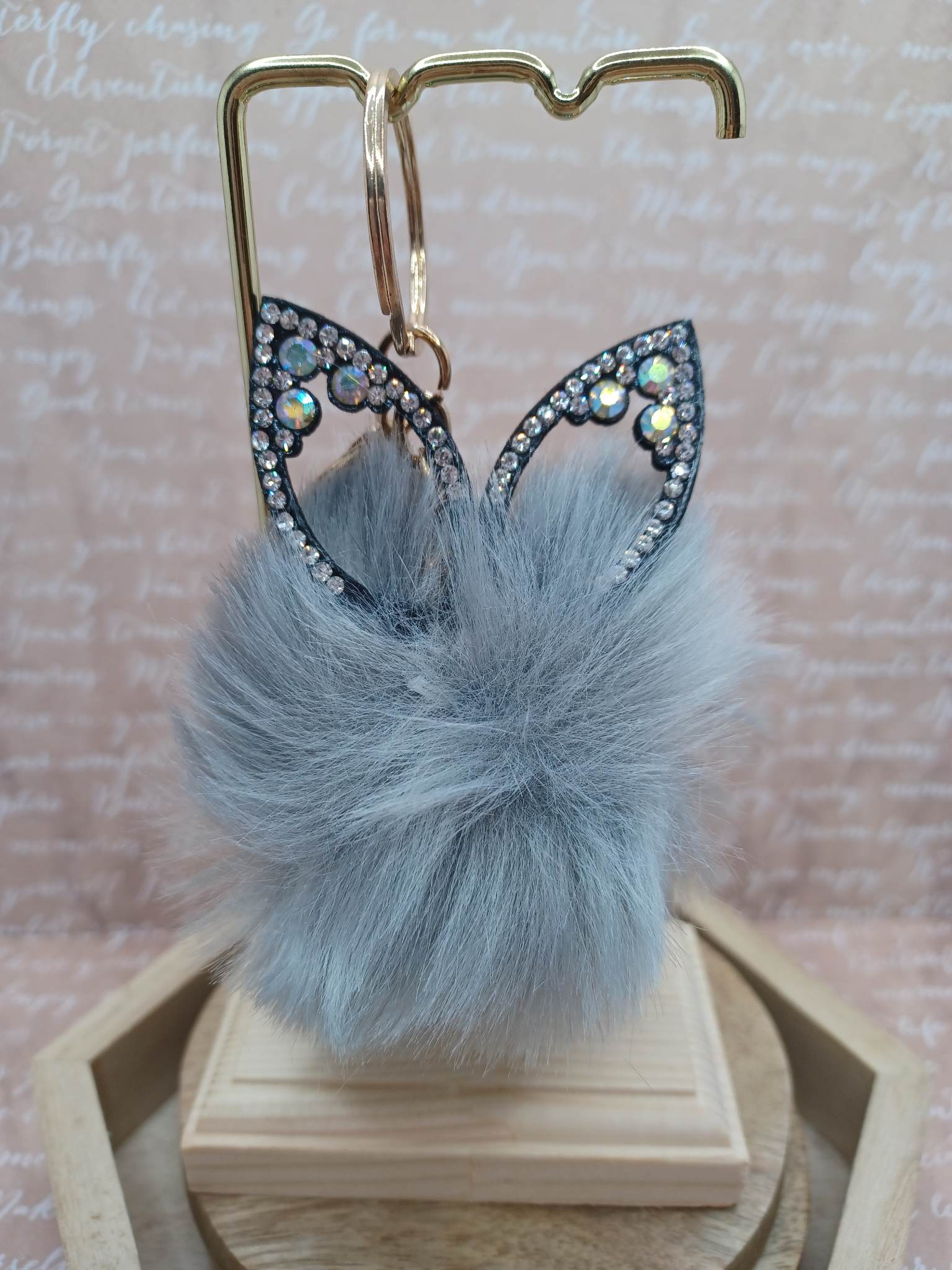 Grey Fox Pom Pom Keychain w/ Mermaid Rhinestone Ears