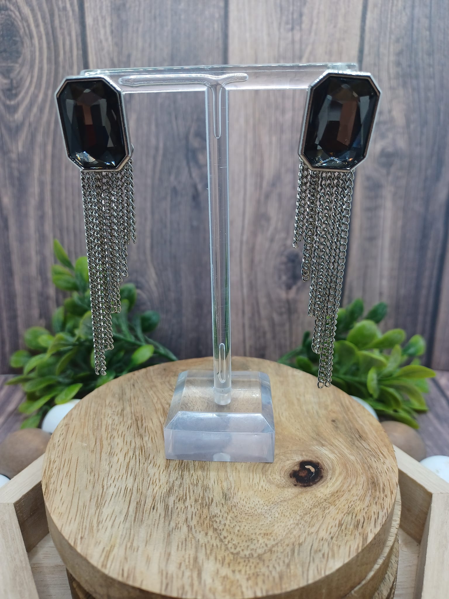Gunmetal Rhinestone Earrings w Silver Dangle Tassels