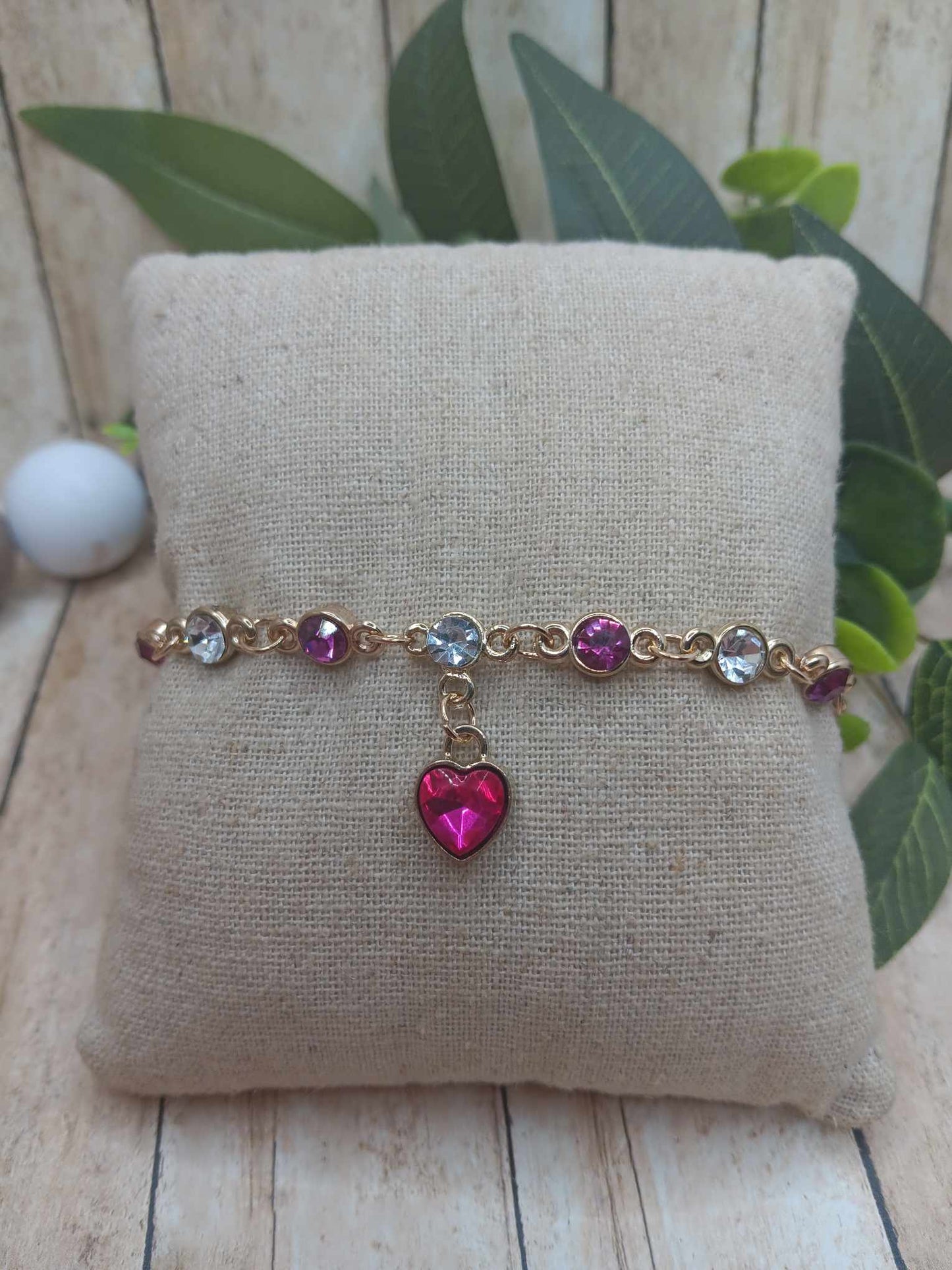 Hot Pink & White Rhinestone Heart Bracelet - Gold