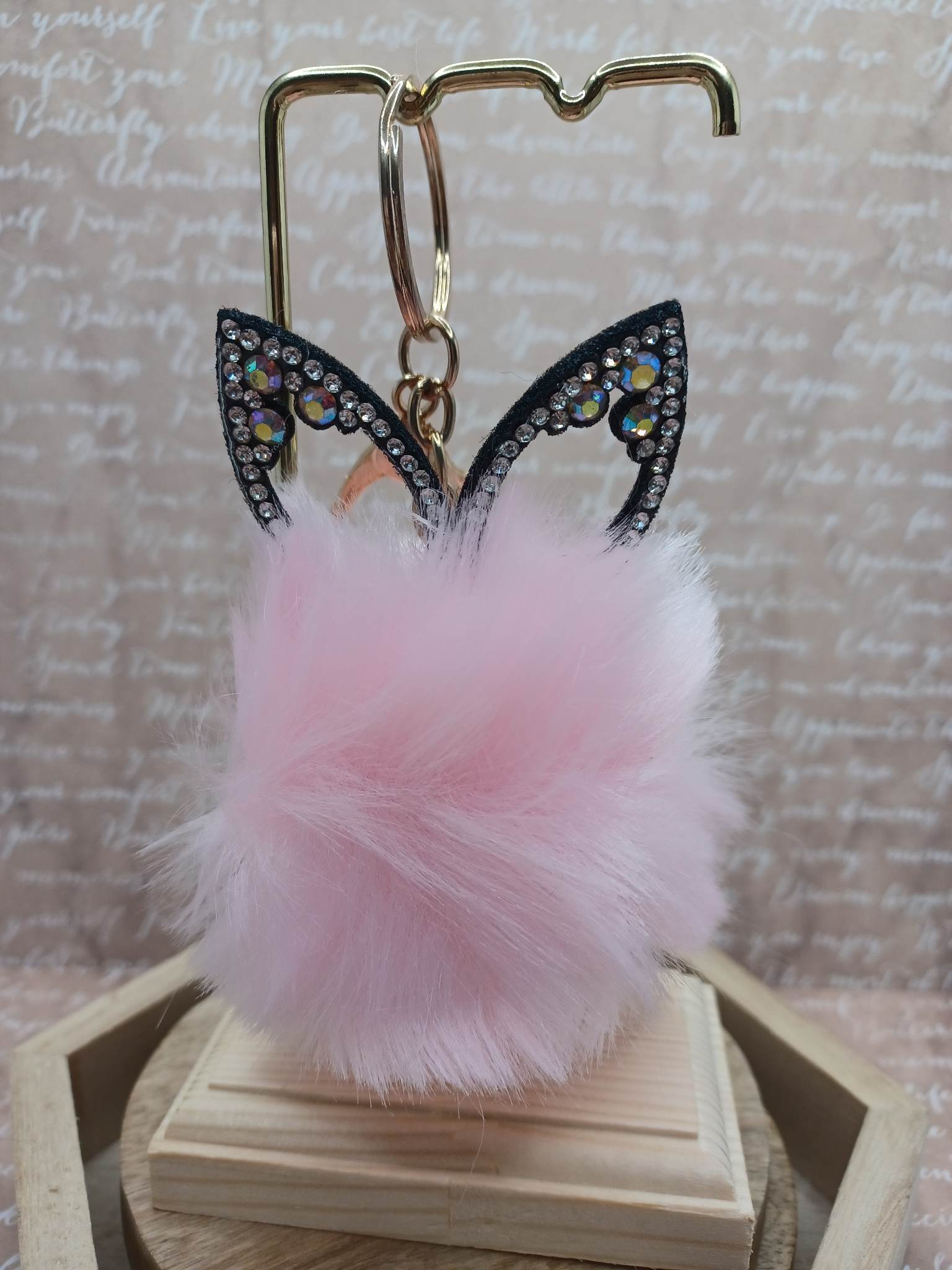 Pink Fox Pom Pom Keychain w/ Mermaid Rhinestone Ears